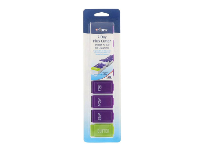 A 7-day pill organizer with a cutter for precise dosage, designed for easy and convenient medication management on a weekly basis.