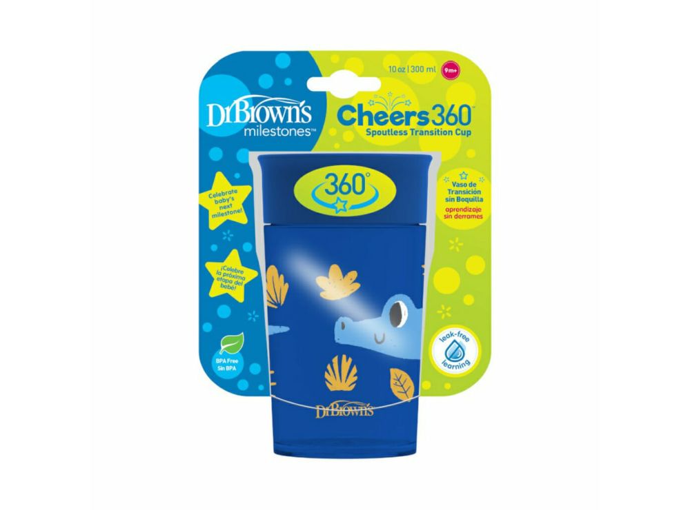 Dr Brown's Cheers 360 Transition Cup for 9 months+ features a larger size and spill-proof design, perfect for toddlers learning to drink.