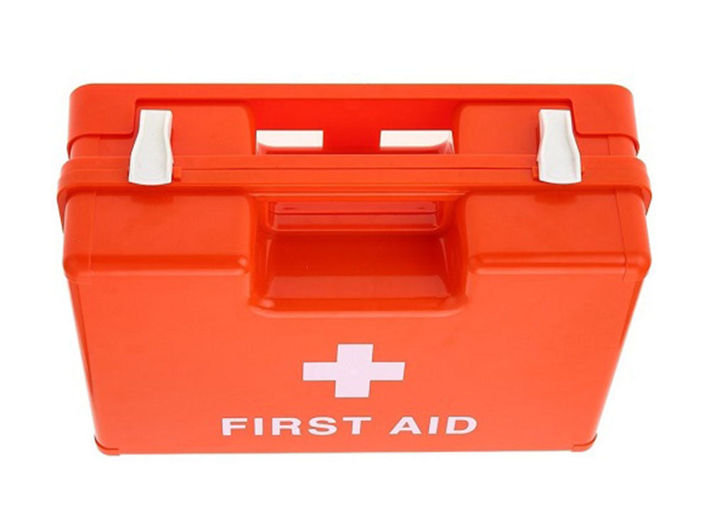 A compact first aid kit in a red box, containing essential medical supplies for emergencies.