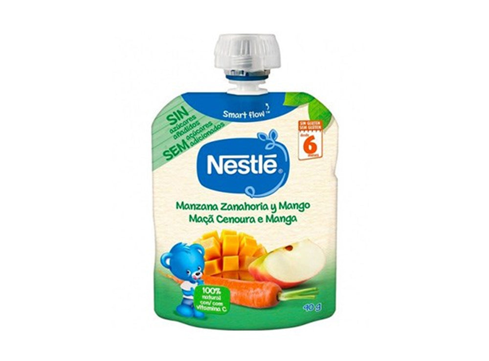 A baby food puree with a blend of apples, carrots, and mangoes, designed for infants' taste and nutrition.