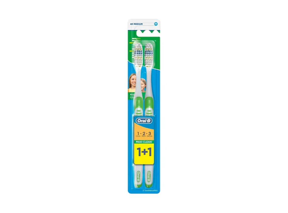 A medium-bristle toothbrush designed for effective cleaning and plaque removal. This pack includes two toothbrushes for convenience.