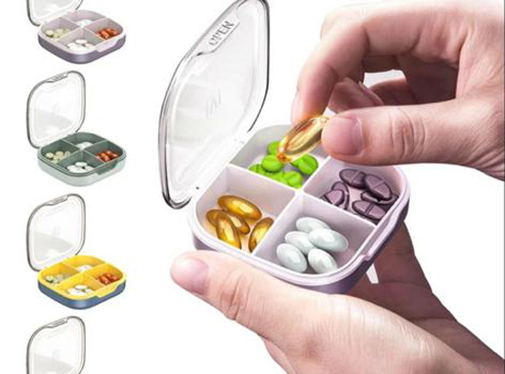 Orange-colored pill box with 4 grids for storing pills and organizing your daily doses.